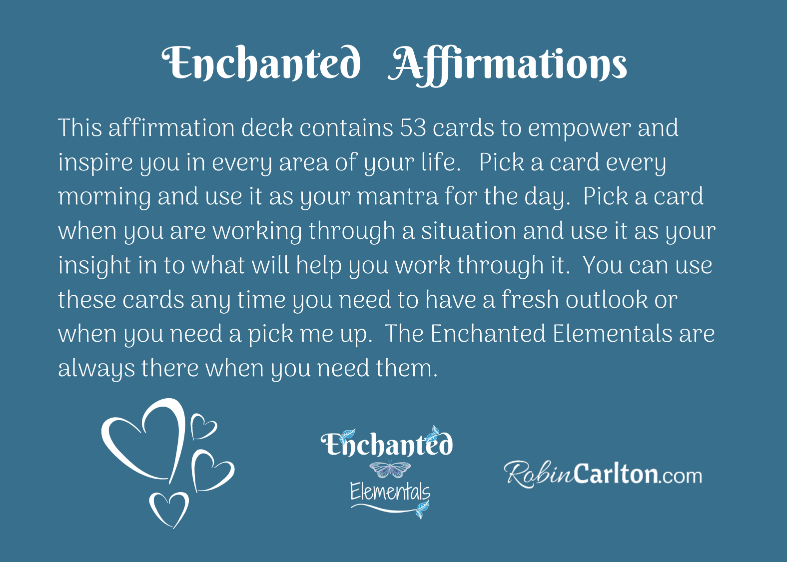 The Enchanted Affirmations Card Deck is a unique affirmation card deck featuring the Enchanted Elementals. These magical cards each feature a beautiful being and a powerful affirmation that will help you to connect with your inner strength and intuition. Each card contains special symbolism to help you remember to stay true to yourself and your heartfelt dreams.