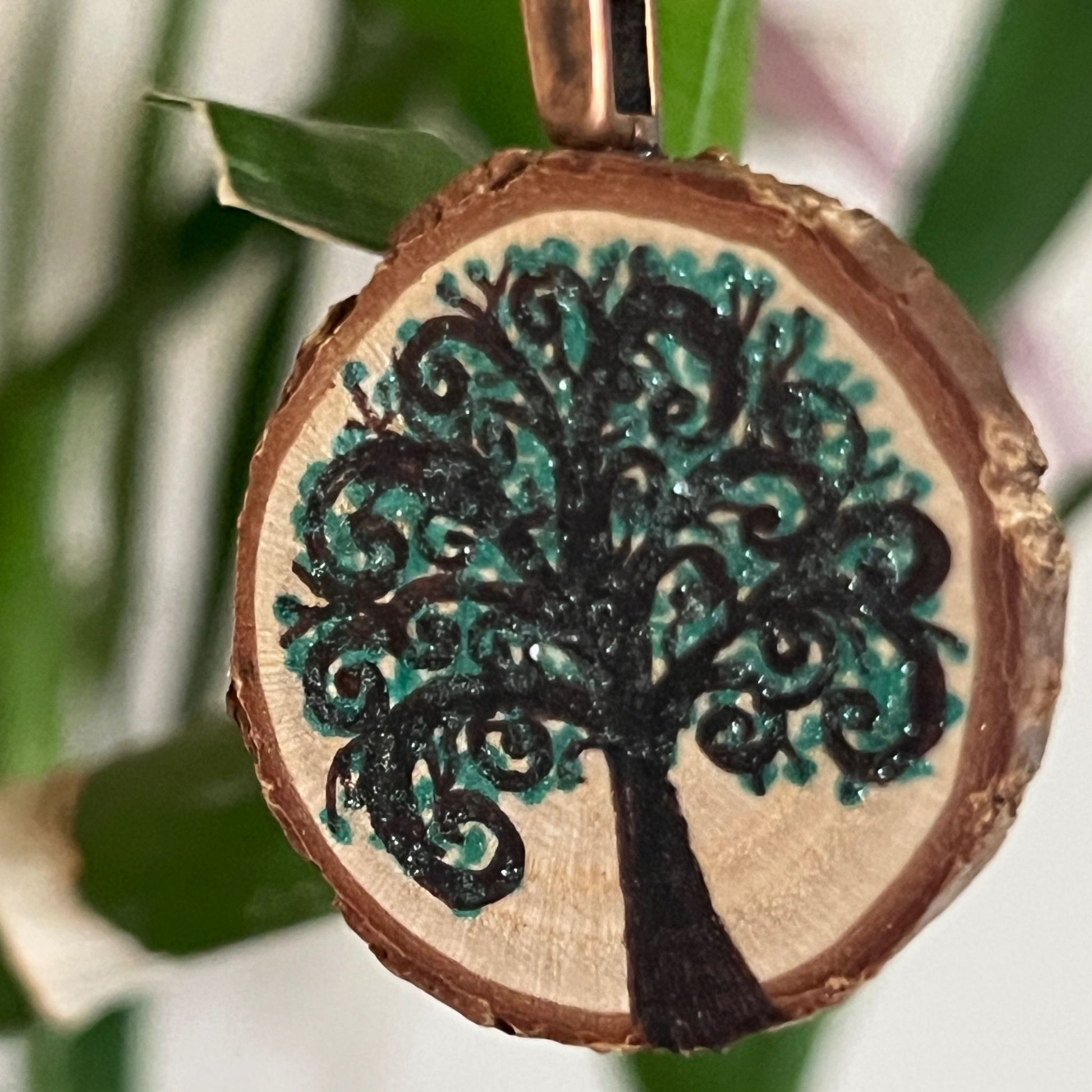 This is an original, unique pendant with a hand drawn tree on a tree branch using colored pencils and/or markers.