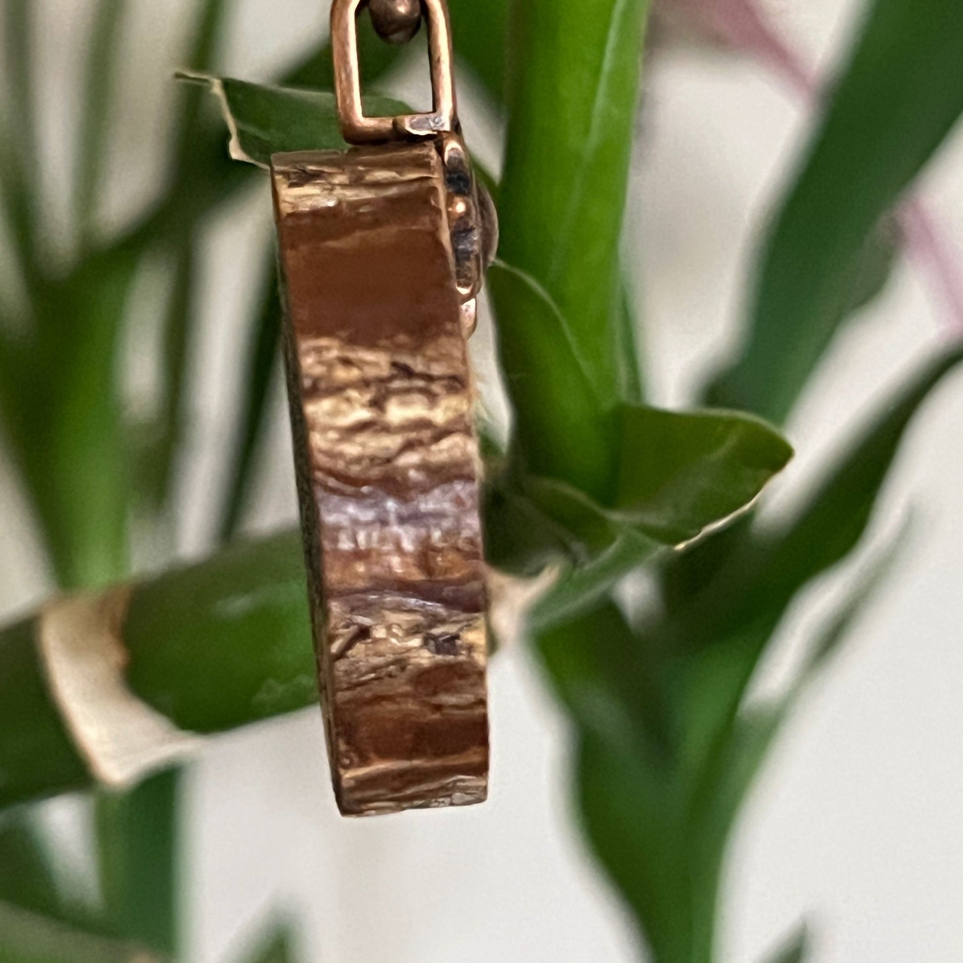 This 1" round wood piece with bark comes with a 23" copper plated ball chain. Drawing has been sealed to protect it.